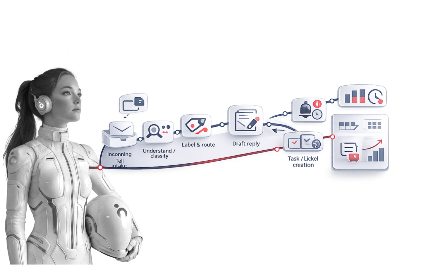 Ontvangen → Begrijpen → Classificeren → Labelen → Concept opstellen → Verzenden → Actie starten → Monitoren & optimaliseren.